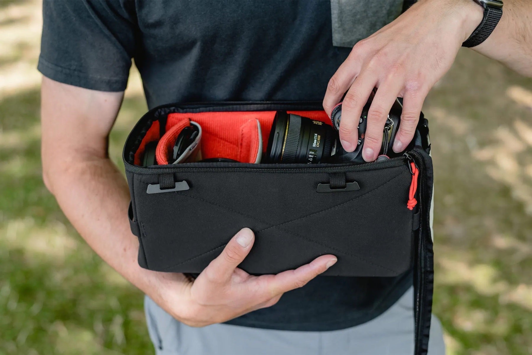 Turn any backpack into a camera bag. Designed to fit perfectly inside our MTW Backpack and Tote (available separately), the Camera Insert is a perfect way to carry your essential camera kit. It also works inside most other daypacks if you want some extra protection for your camera gear. With a large side access zip and interchangeable dividers, you can set it up however you like. Carry up to a Canon 5D (no battery grip) sized camera with a 70-200mm lens and room for extras. The opening can also be left open and tucked out of the way for super quick access, especially with backpacks that have side zipper access. Unlike other large, bulky camera ICUs, this one is just big enough to carry your essential camera kit and leave room for other gear in your bag.